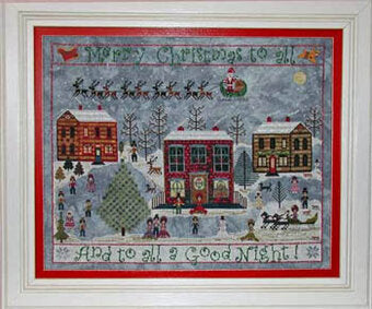 "Merry Christmas to all and to all a good night!" Model stitched on 32 Ct. Nocturne by Picture This Plus with Gentle Art Sampler threads, Weeks Dye Works floss, Kreinik Blending Filament, and Mill Hill beads. Stitch count: 260W x 210H. ( DMC alternates are 745 819 732 902 white 935 500 890 930 3685 869 434 321 938 712 3823 739 917 3716 317 321 902 3799 779 3362 680 370 371 3371 372 326).