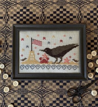 Cross stitch pattern from Stitches By Ethel featuring a sand castle flying the American flag, a crab, and a bird on a beach!
