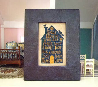 "Dear House, You are really very small. Just big enough for love that's all". Model stitched on 40 Ct. Vintage Examplar by Lakeside Linens with Gentle Art Sampler threads and DMC floss. Stitch Count: 70W x 115H. Design Size: 4" x 6"