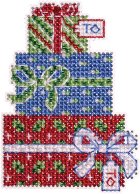 This Mill Hill beaded kit features of three brightly wrapped Christmas gifts. Kit Includes: Beads, treasures, 14 Ct. perforated paper, pattern, floss, needles, magnet and instructions. Finished size: 2.25" x 3.25"