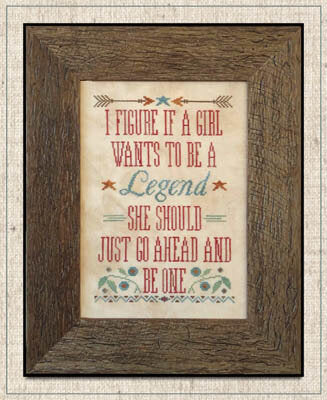 "I figure if a girl wants to be a legend, she should just go ahead and be one" Model stitched two over two on 32 Ct. Toffee Linen from Silkweavers using Classic Colorworks. Stitch Count: 109W x 158H. Design Size: 6 3/4" x 9 7/8"