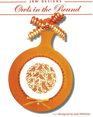 The stitch count is: 58 round. The over two model was stitched on a #32 Belfast linen/Fairy Dust. The over one model was stitched on #28 Antique White linen from Permin. The thread for both was Persimmon from Weeks Dye Works. The finished size on #32 is: 3.62" round and over one is 2.07" round. The model over two was mounted on the lid of a glass jar from Hobby Lobby and the model over one was mounted on a cutting board from Hobby Lobby. Both were painted and the small model was trimmed with pom pom trim from Lady Dot Creates in the color: Jack.