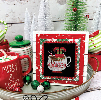 Cross stitch pattern from Primrose Cottage Stitches featuring an elf face first in a cup of hot cocoa!
