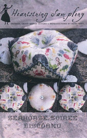 Cross stitch pattern from Heartstring Samplery featuring a biscornu decorated with little seahorse!