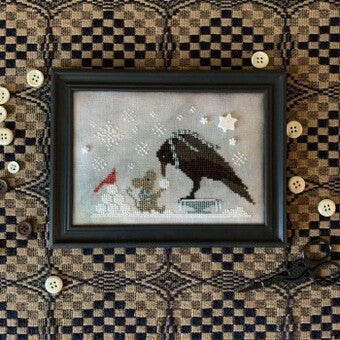 Cross stitch pattern from Stitches By Ethel featuring a crow and mouse making friends at Christmas!